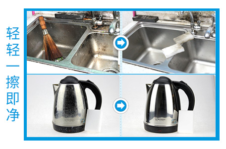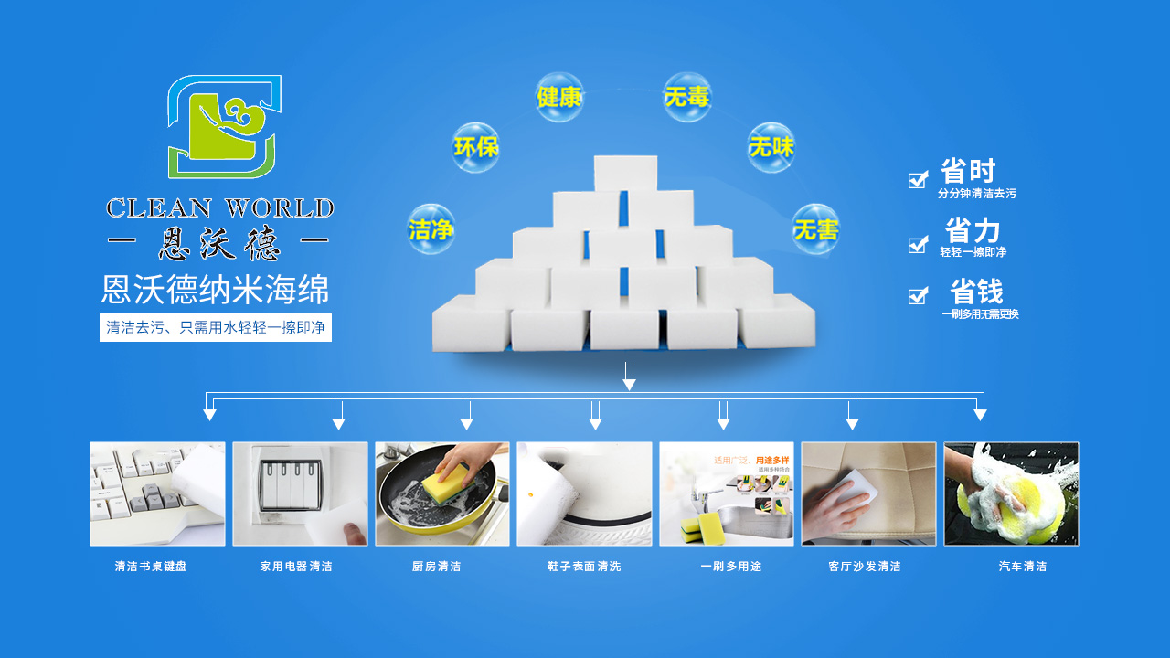 納米海綿是一種有高開孔率的三維網格結構的新型泡沫塑料,采用物理去污的機理,依靠納米海綿特殊三維網狀結構(每個小顆粒比頭發絲的萬分之一還?。⑵浣窈螅鋬炔烤蜁纬蔁o數個納米級毛細管開孔結構,在抹拭過程自動吸附物體表面的污漬。所以這些海綿塊只需要加一點水,就變成清潔力強的產品,可以擦拭頑固的污漬,也不用擔心會有刺激性化學物質。納米海綿可以用于家中的大多數物品的表面,從油煙機到灶臺、墻壁上的畫畫印記、浴室里的水漬水垢、浴缸污垢、茶杯里的茶漬、墻壁劃痕等通常難以擦洗的表面。